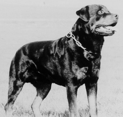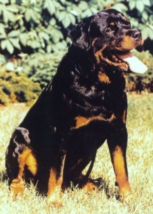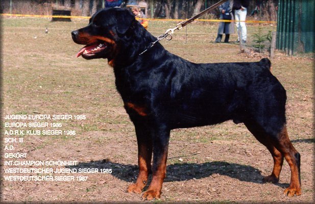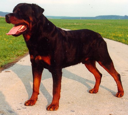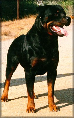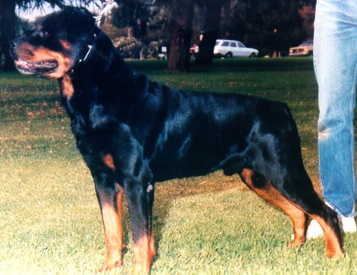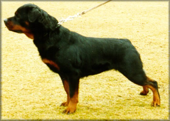 | Critique: Middle to large dog, powerfully built. Of excellent type. Excellent bone with large powerful male head. Short broad muzzle. 1A eyes. Very dark brown eyes. Middle size, correctly carried ears. Broad skull, pronounced cheek muscles. Very good fill under the eyes. Powerful neck. Straight front with very good forechest. Well knuckled feet. Excellent over and under lines and correct croup. Very good rear angulation. Powerful rear muscles. Very good movement. Very good coat and rich mahogany markings. Scissor bite, full dentition. | ||||||||||||||||||||||||||||||||